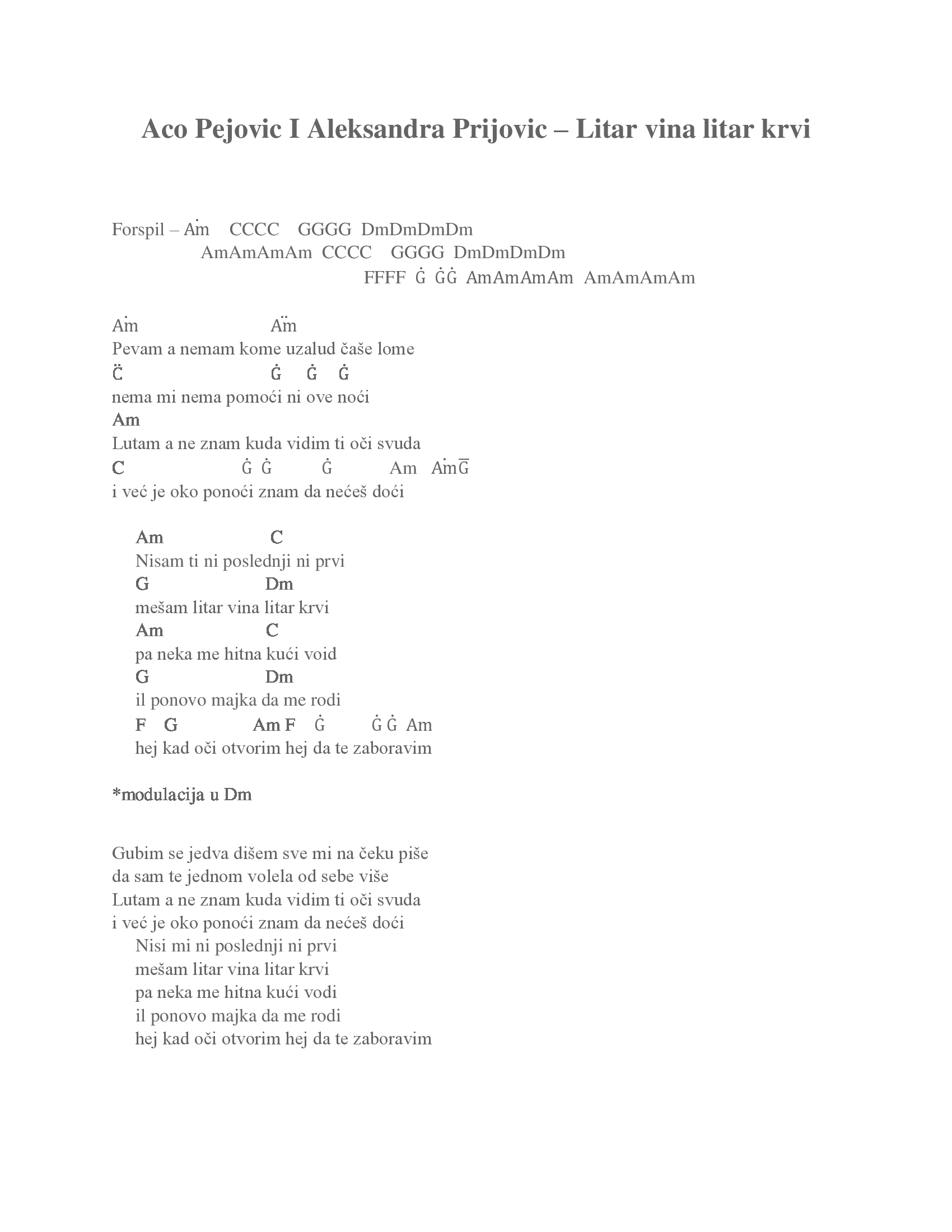 Aleksandra Prijovic i Aca Pejovic - Litar vina litar krvi Akordi